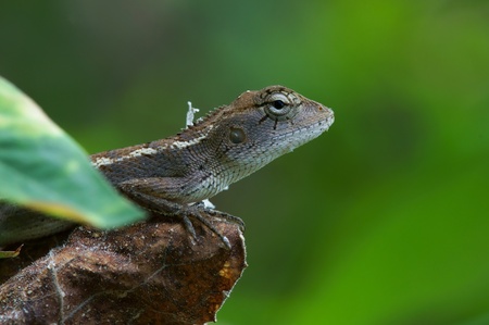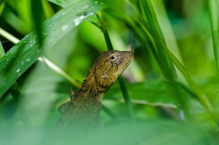 Baby Oriental Garden Lizard (Calotes versicolor) on the leaves. Found widely in Asian countries. camouflage garden lizards. Close up chameleon details.