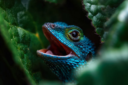 A colorful reptile with iridescent blue and green scales curiously emerges from dense leafy greenery, highlighting vibrant natural camouflage.