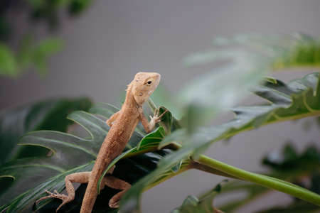 Baby Oriental Garden Lizard (Calotes versicolor) on the leaves. Found widely in Asian countries. camouflage garden lizards. Close up chameleon details.
