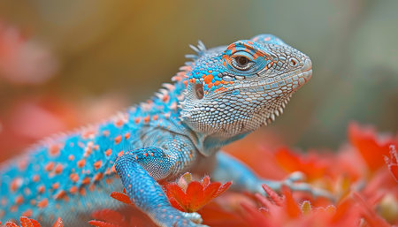 Close-up of a lizard surrounded by orange flowers, creating a captivating nature scene