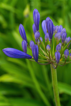 Agapanthus africanus or African lily flower with a vibrant green foliage blurred background.