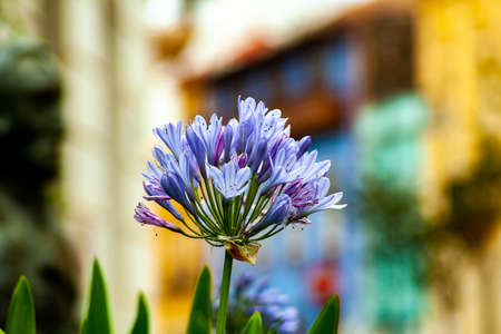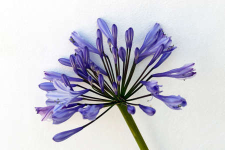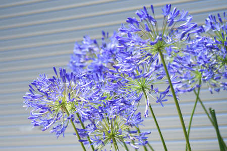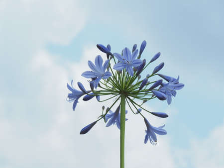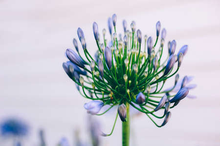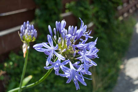 The view of blue agapanthus close up. Side view of a flower in bloom in a sunny day.