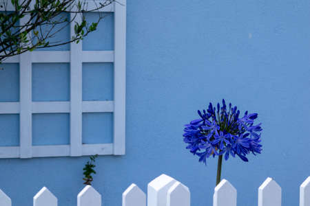 Blue flower growing in little front garden with white fence, light blue house wall and white crate in background, British coutryside by the sea