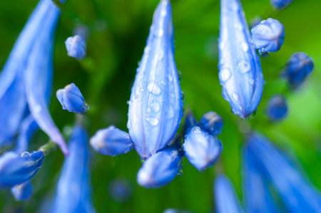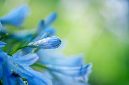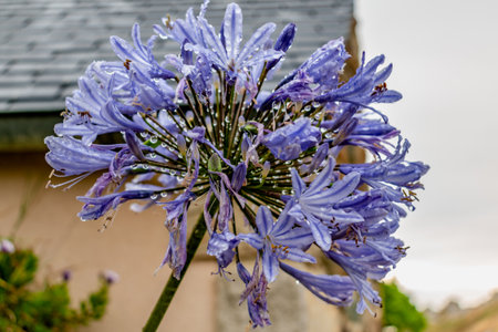 Agapanthus praecox, blue lily flower during tropical rain, close up. African lily or Lily of the Nile is popular garden plant in Amaryllidaceae family. Tanzania, east Africa