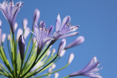 close up view to the blue lily -Agapanthus praecox- on a sunny day against blue sky
