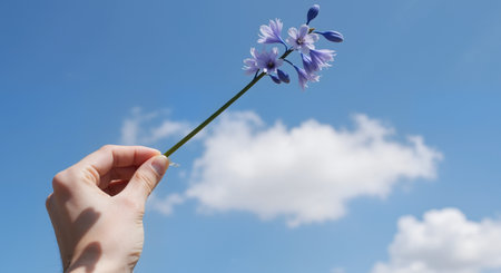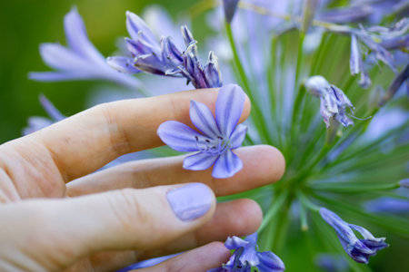 Lily of Nile flower (Agapanthus africanus hybrids species) - blue-flowered perennial flowers blooming. Summer garden. Lilac blue flower in female hand