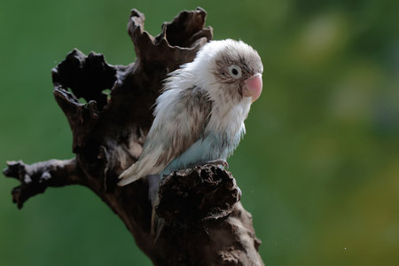 Cute lovebird perching on a tree trunk with pink background