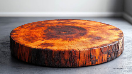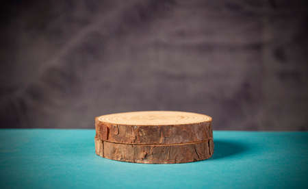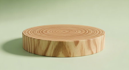 showing circular wood slice pedestal with concentric rings and grain on a light green background. resolution
