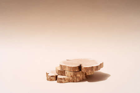 Woodcut lying on a trendy beige background. A wooden platform for luxury and natural cosmetics or products presentation. Wooden tray mockup in the sunlight. Top view
