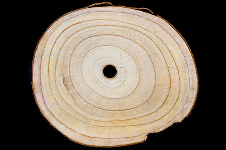 Paulownia wooden slice with annual rings (growth rings) isolated on black background. Fast-growing and lightweight sustainable wood