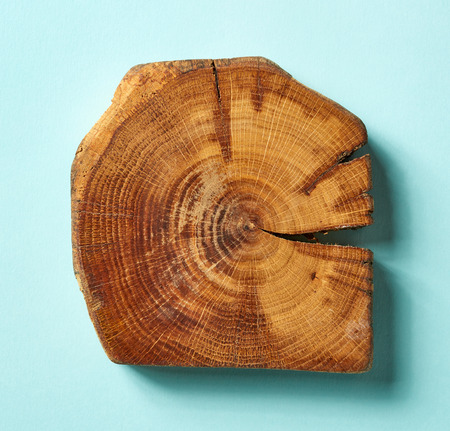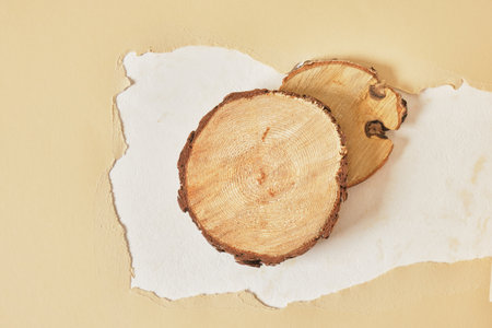 Cross section of a tree trunk on beige background, nature and growth concept.