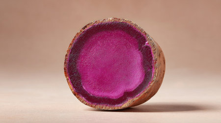 This image showcases a vibrant cross section of a fresh purple root vegetable, highlighting its rich color and natural texture, ideal for health-focused themes.