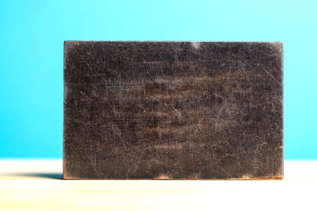rectangle of metal on a wooden table against a blue wall. Scratched metal surface for background texture