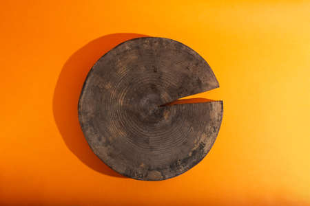 Flat lay with empty showcase of wooden circle podium on orange background