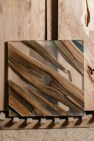 Exclusive handmade table of solid wood and epoxy resin on the background of wood boards
