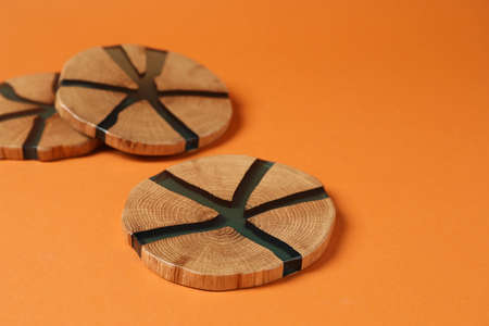 Many stylish cup coasters on orange background