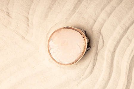 birch stamp on a sandy surface. empty wooden stamp