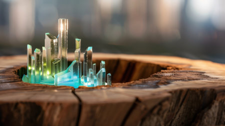A captivating scene of a crystal city emerging from a textured wooden base, illuminated by vibrant light effects, showcasing exquisite artistic detail and creativity.