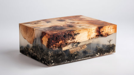 This visually striking block features natural wood encased in resin, showcasing unique textures and patterns that celebrate craftsmanship and design.