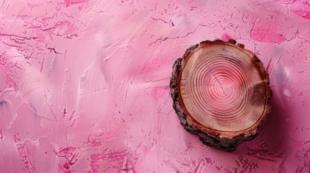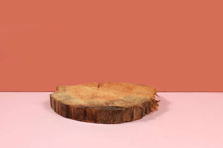 Empty pink table with wood saw cut for product presentation, rustic style, minimal ecological concept, summer or autumn layout for design, scene with geometric shapes with place for text, selective focus