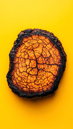 A close up of a burnt tree stump with orange and yellow rings, AI
