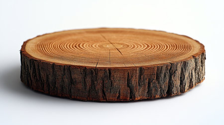 Wooden tree slices with annual rings and texture isolated on white. Circular background with an organic feel.