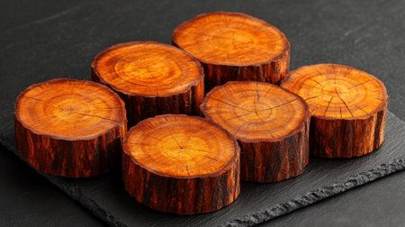Beautiful wooden slices with vibrant hues display unique patterns on a dark surface.