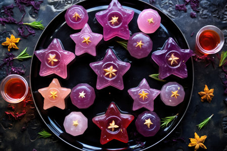 overhead shot of jelly-filled donuts on a star-shaped platter, created with generative ai