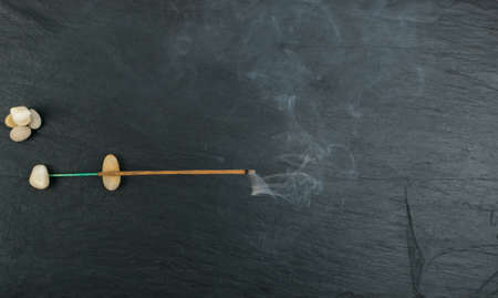 Burning indian incense aroma sticks with smoke on black stone background. Fragrant smoky sandalwood stick top view