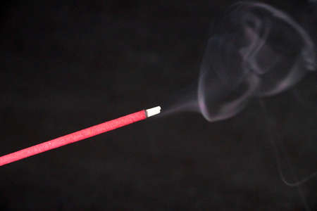 A close-up of a lit incense stick releasing delicate wisps of fragrant smoke into the air, creating a tranquil atmosphere and evoking feelings of peace and meditation.