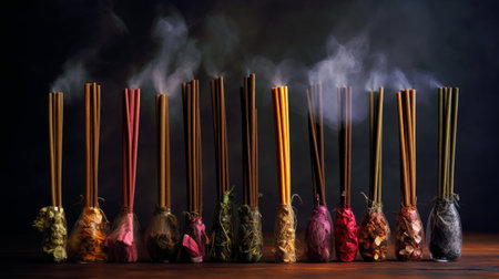 Incense sticks smoldering with smoke on a dark background