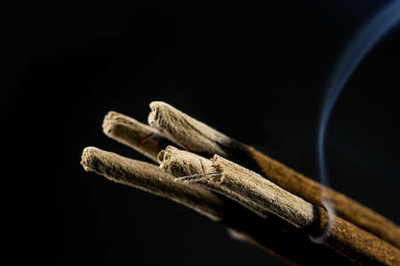 Smoking sandalwood incense on a dark background. Used for aesthetic reasons, aromatherapy, meditation, and ceremony.
