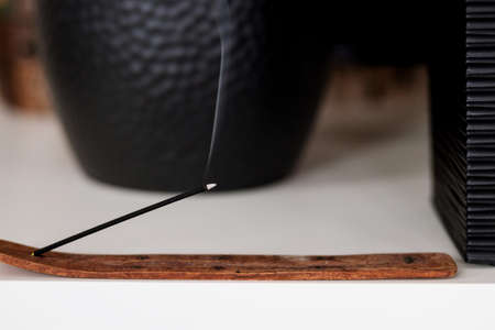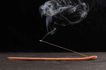 Smoke curls of incense stick in wooden holder for relaxation and meditation exercises, black background. Aromatherapy session with burning aroma stick, pleasant aroma and incense