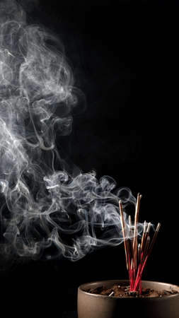 Burning incense on a white smoke censer on a black background is used as a background image of worship, sacred objects of Buddhist beliefs.