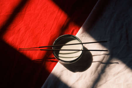 Light and shadows cast on a ceramic incense holder and sticks showing zen, wellness and mindfulness