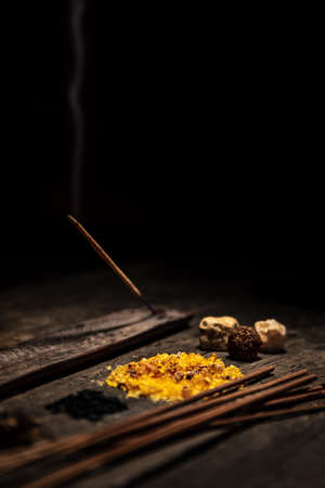 Joss sticks and esoteric and spiritually ingredients, incense and healing herbs, copyspace