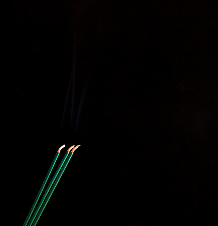 Closeup of calmly burning incense sticks with blue fume on black background