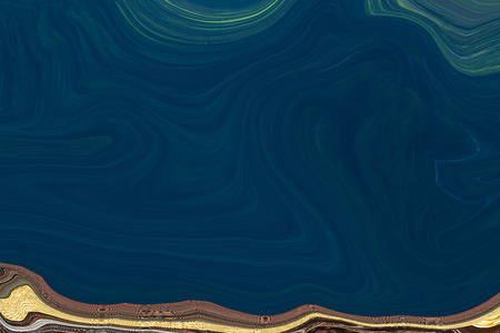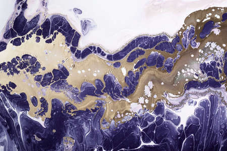Acrylic Fluid Art. Blue colors waves in abstract ocean of blue paint and golden swirls. Marble effect background or texture