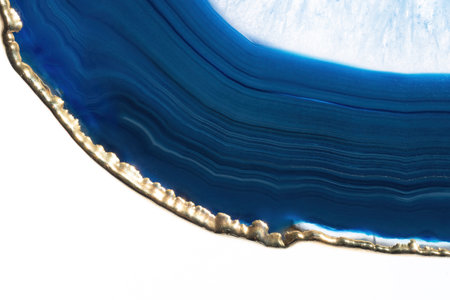 Blue agate with gold veins on white marble background. Close up.
