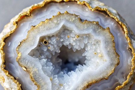 Amazing blue agate cut cross section with gold edge. Natural crystal mineral line pattern formation. Beautiful texture macro photo background of precious stone