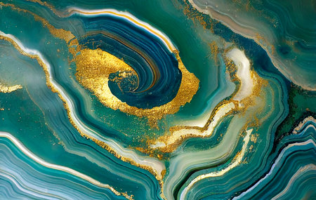 Fluid Art. Liquid Metallic Gold and gold in abstract Tidewater Green waves and stains. Marble effect background or texture