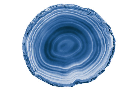 A painted Blue agate slice with white veins on a white background highlights nature's beauty. Its layered structure makes it a stunning natural decor piece.