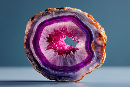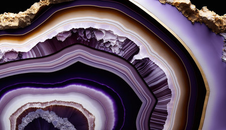 Intricate layers of agate stone display a vivid spectrum of purple, pink, and blue hues, showing shimmering crystals and smooth surfaces that highlight natural artistry.