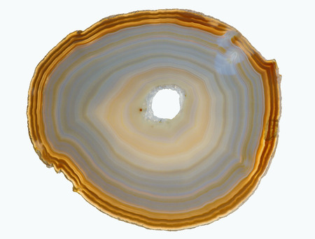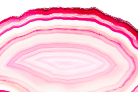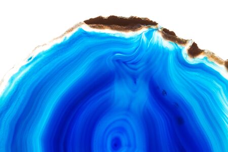 Amazing red Agate Crystal cross section isolated on white background. Natural translucent agate gemstone surface, Blue abstract structure slice mineral stone macro closeup with copy space