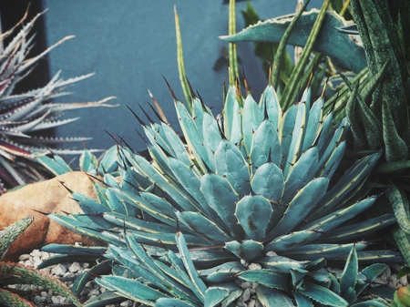 Blue agave plant also known as tequila agave growing among the yucca plants in the botanic garden