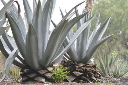 A closeup shot of a beautiful Agaves Tequila plants in Mexico in an agricultural field