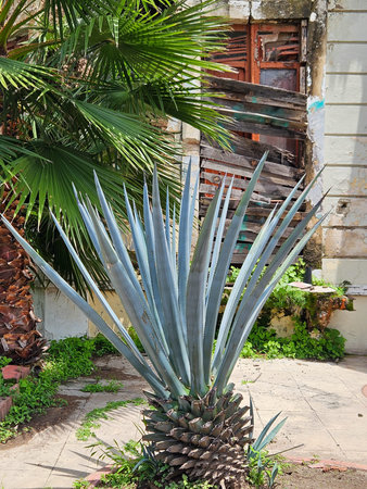 A blue agave plant flourishes in a neglected garden beside a decaying abandoned building with boarded-up windows in Guadalajara, Mexico, bathed in sunlight