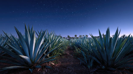 A panoramic wide view of Blue agave field growing closely together under a clear night sky starlight illuminating leaves soft shadows calm natural atmosphere ultra realistic photography cinematic wide composition lifelike natural scene