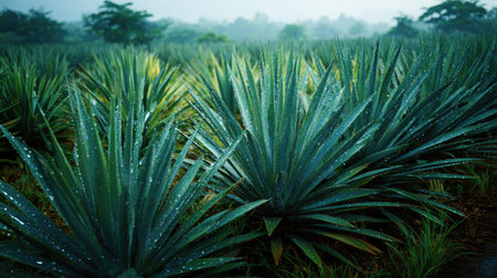 A panoramic wide view of Blue agave field growing closely together under light drizzle soft raindrops on leaves ultra realistic photography natural daylight cinematic wide composition lifelike natural scene