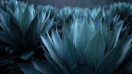 A panoramic wide view of Agave field growing closely together under moonlight silver glow on leaves serene calm atmosphere ultra realistic photography cinematic wide composition lifelike natural scene